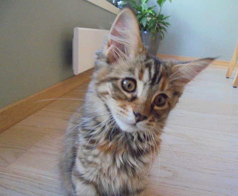 Lang håret på halen. Veldig nysgjerrig katt som går gjerne inn i hus til andre.