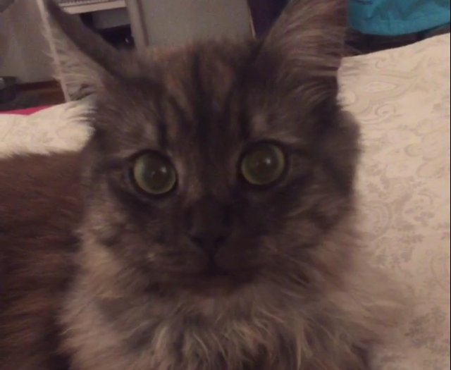 Hun er som et kinderegg: mørk på utsiden og hvit på innsiden. Grønn-gule øyne. Myk og lang pels.