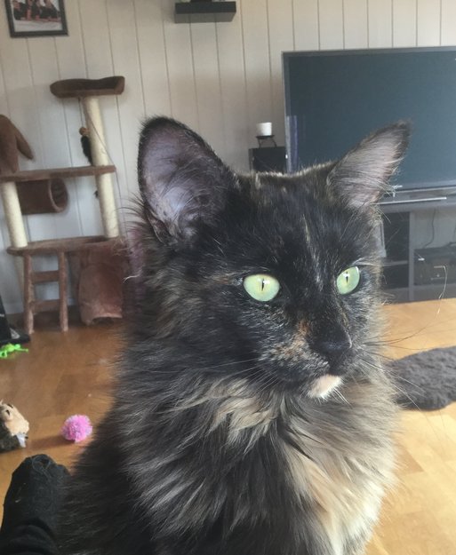 Ho har en lang bustete hale og en lysebrun "sokk" på ene bakbeinet. Ho er veldig pratsom,men skeptisk til fremmede.