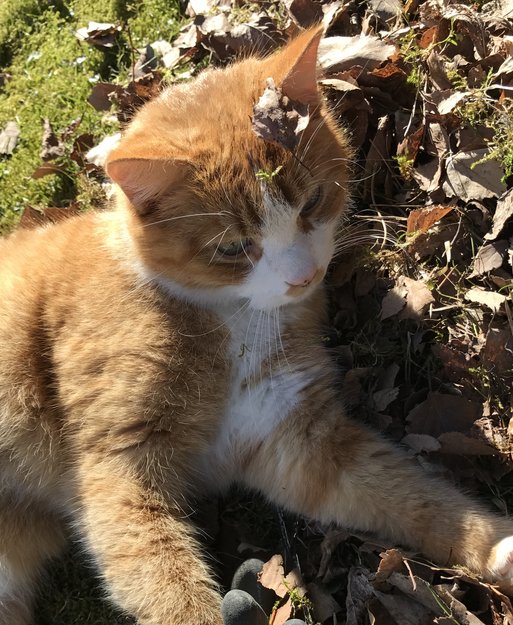 Mellomstor kastrert hannkatt, gulbrun/ hvit. Halen mer stripete enn resten av kroppen.