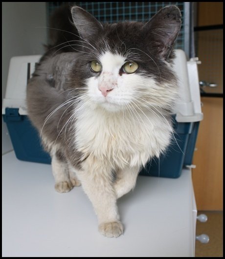 Langhåret ukastrert hannkatt. Grå over, hvit under og i ansiktet. Ikke øre eller id-merket. Sosial og trygg.