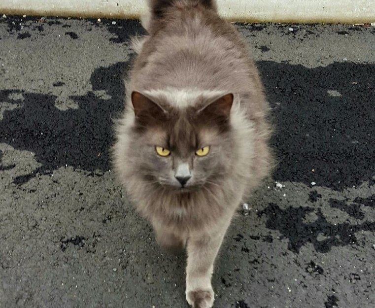 Grå i pelsen med en liten hvit flekk på brystet. Han har også en svak M i pannen. Pleier å være kontaktsøkende og kosete