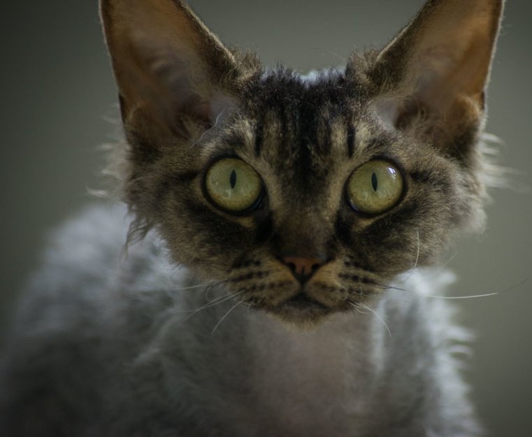 Hun er av typen Devon Rex, kort pels og liten av vekst.
