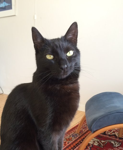 Helt sort, noen få hvite hår på brystet. Slank og elegant. Litt hengebuk.