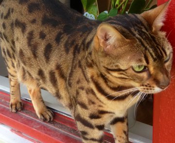 Brun med sorte spotter og litt hvitt på brystet og magen.
