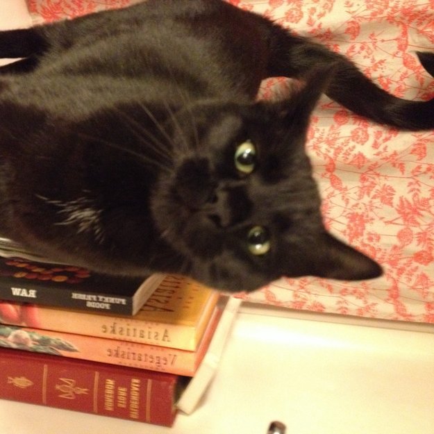 3 år gammel hunkatt. Helt sort, med bitteliten nesten ikke synlig hvit flekk foran på brystet. Hengemage. Litt sky men lar seg klappe.
