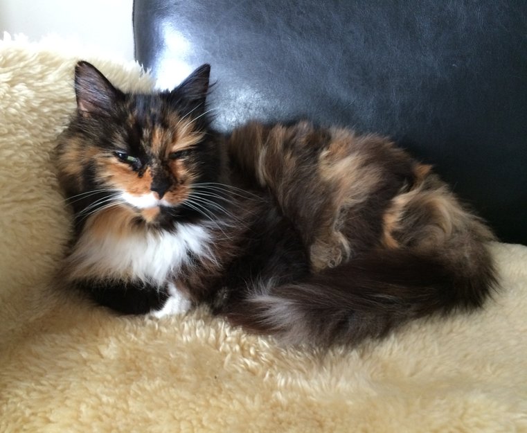 Lang pels. Har en del klumper i pelsen på sidene og under magen. Hadde klippet henne på ene siden. Svart og brun, hvite poter og hvit på brystet. Grønne øyner. Er merket i begge ører.