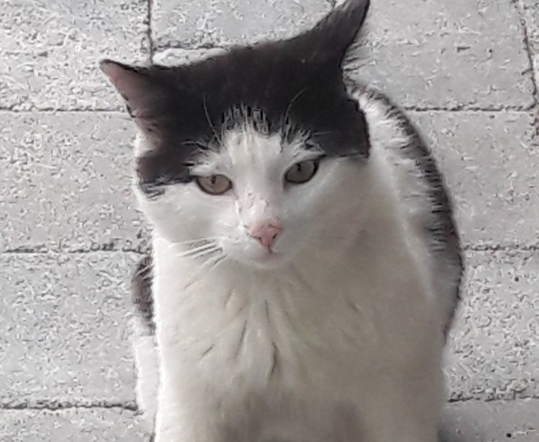 Ensfarget svart hale, ellers ganske vanlig tofarget pus. Litt kraftig hode