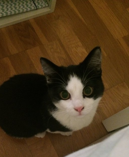 Liten og nett hunnkatt. Mest svart og noe hvit pels.