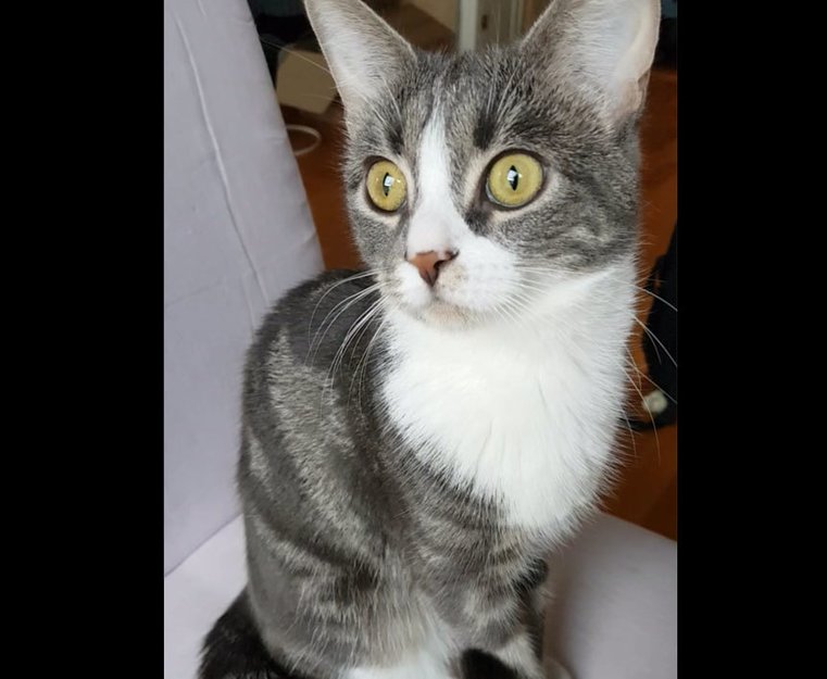 Chichi will turn 1 year old this year. She's not chipped or neutered yet. She looks small and slim. Her coat is short with different shades of grey stripes and white color around her chest and feet. She is an indoor cat. We didn't notice that she got out. Please if you have any information give me a call: 48643268