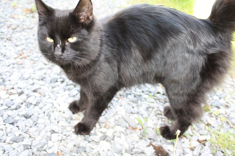 Katten er helt sort, langhåret med en veldig stor hale. Litt stor til å være under 1 år. Er veldig kosete og glad i mennesker.