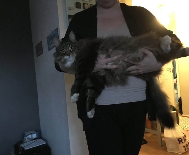 Grå/brun spraglete (litt stripete) Hvit på brystet, og deler av munnen/snuten, 4 hvite poter og litt hvit på brystet. Elsker kos, men han må bli trygg på dem først. Har et høyt mjau.