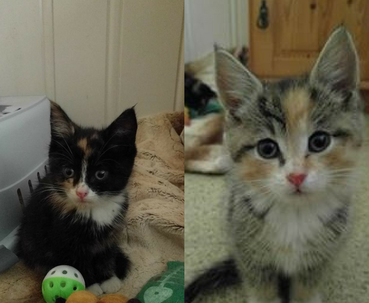 En lys og en mørk tricolor kattunge på ca 6 uker. Tøffe og tillitsfulle og antakeligvis vant med hund.