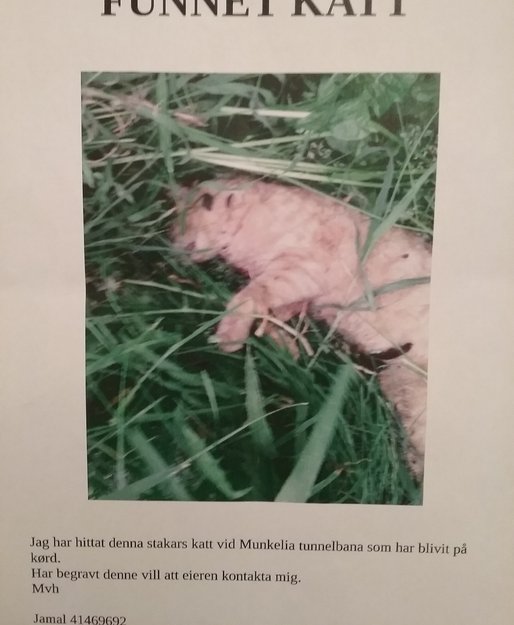 Tyvärr har hittat en död katt som troligen har blivit på körd av ebba bil. Funnit den i måndag, har ringt polisen,ambulansen,veteneren, kommunen, ingen kunde hjälpa mig, har begravt denna stakars katt och satt läppar i området för att ägaren kontakta mig.