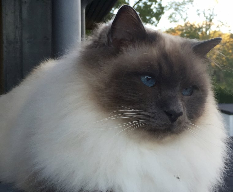 Blåmasket Hellig Birma. Hvot med sort ansikt, poter og hale. Sterke blå øyne.