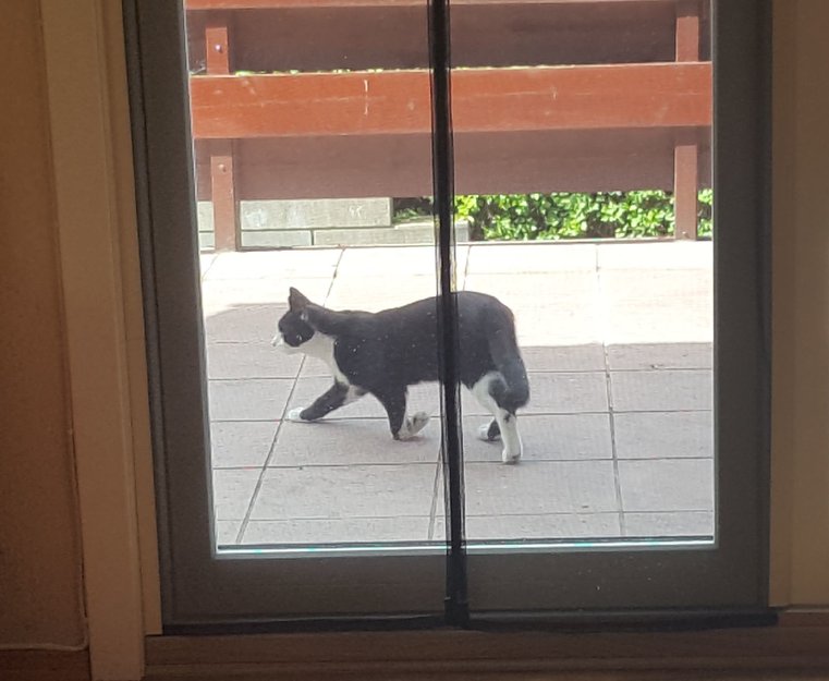 Sort og hvit katt. Den er sort på kroppen med hvit maske, hvite poter og hvit på magen. Den har skadet poten sin og trenger veterinær.