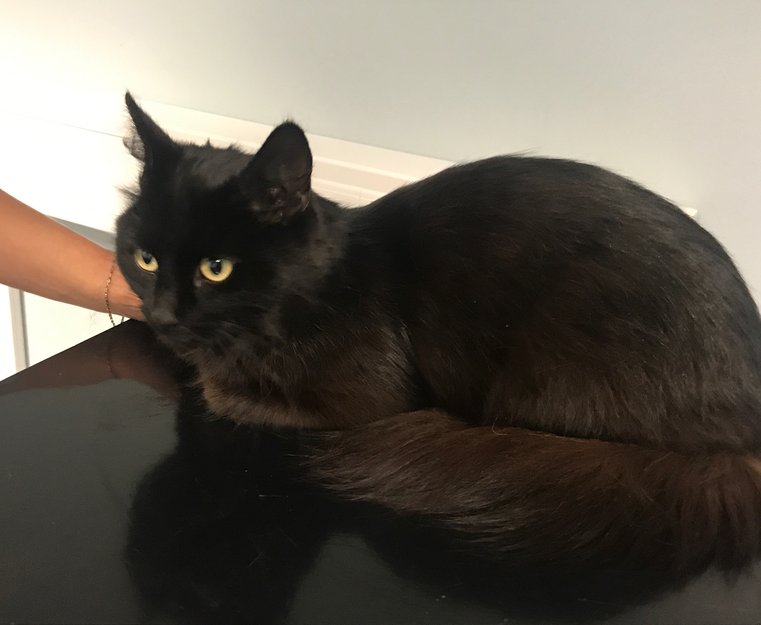 Kort pels, tykk pels på hale. Ser blank og fin ut i pelsen. Rolig og kosete katt. Litt bruntoner i pelsen.
