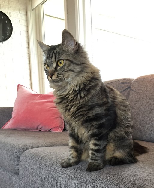 Hun er 2 år gammel, men kan se ut som en stor kattunge da hun er liten og nett. Hun har kortere pels på ene siden av magen etter å blitt kastrert. Hun har grønt merke i øret siden hun er ID merket. Veldig kosete og glad i mennesker.