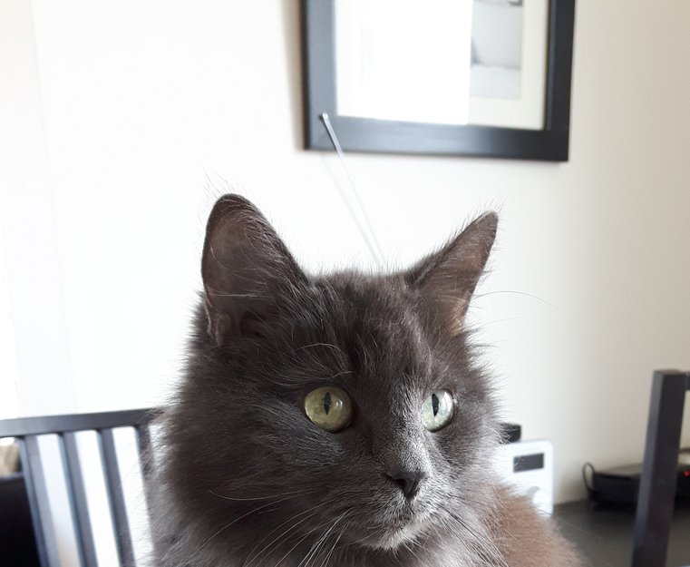 Hun er langhåret grå med en liten hvit flekk øverst på brystet. Veldig kjelen, men litt skvetten av seg.