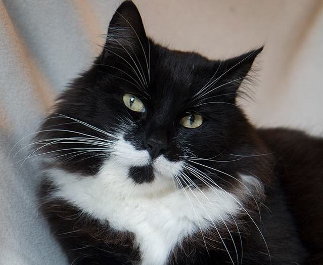 Svart lang pels, litt hvitt i ansiktet og brystkassen, hvite poter. Er kastrert.