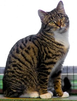 "Laila" er brun-svart tigret med hvit på brystet og magen.