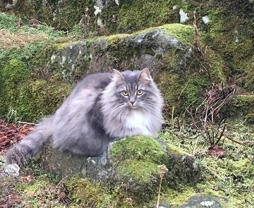 Missy er veldig sky, redd fremmede og kommer absolutt ikke bort til folk. Veldig skeptisk og løper fort avgårde viss hun aner ugler i mosen.. Ble dårlig bilde da ingenting fungerer.. Hun lyder navnet MIssy, er kastrert og id- merket i øret, samt chippet. Er mest sannsynlig ingen som har sett henne da hun holder seg i skogen.