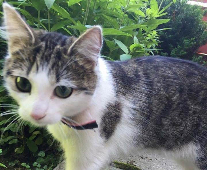 Hvit og brunsvart hunkatt med stripete hale. Veldig kosete. Maler høyt. Ikke chippet. Hadde på seg rosa/svart halsbånd med rosa "stener". Dukket opp utenfor hos meg i Vestlisvingen, nord i Oslo - lørdag 1. juli. Vært her siden da. Mistenker at den kanskje ikke finner veien hjem.
