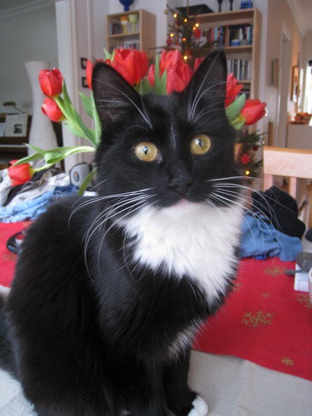 Liten hunkatt, blanding av kort/langhåret. Veldig glad i mennesker.