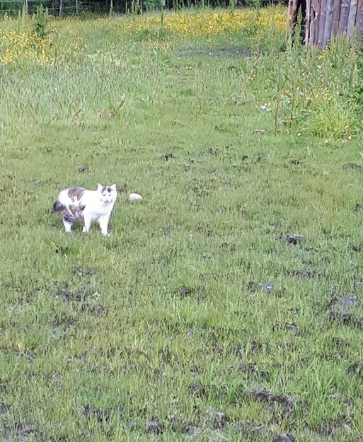 Den har gått rundt gården å husene her et par mnd.ser den daglig.ligger ofte inne i høyet til geitene om natta. Også inne i stallen. Virker veldig redd. Stikker avgårde så snart vi ser den eller prøver å nærme oss. Svart og hvit ,langhåret.