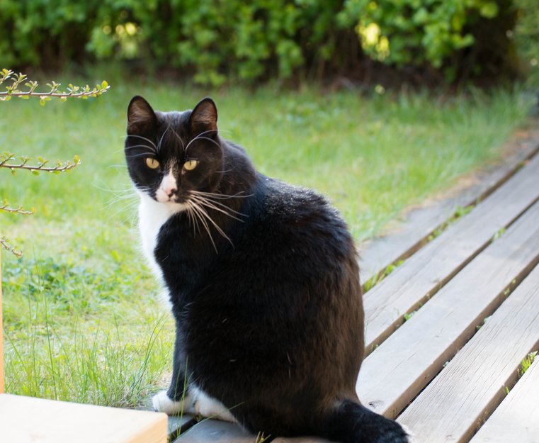 Stor hannkatt, svart og hvit, med helt svart hale. Halve nesen er rosa, halve er svart.