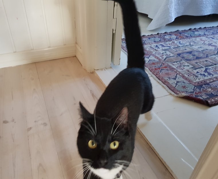 Katten har oppholdt seg i området noen uker. Kom utenfor huset og ville ha kontakt. Den var veldig sulten, fikk mat og vann. Det er en ung hankatt rundt ett år, veldig kosete og trygg. Vant til barn.