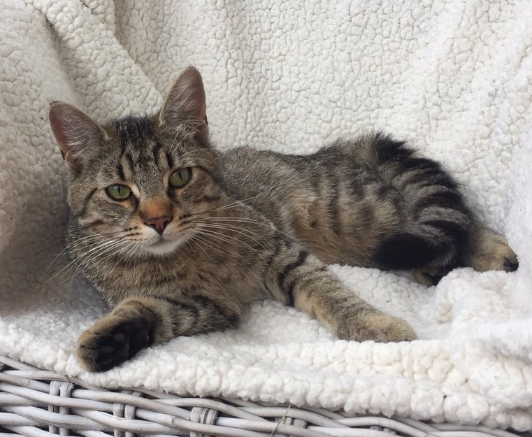 Dette ser ut til å være en ganske ung katt. Den har brun nese, og har en litt langhåret hale. Rask på foten og mjauer høyt og tydelig.