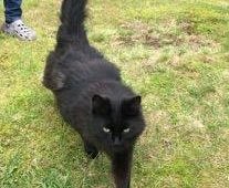 Katten er helsvart, langhåret med floker i pelsen, grønne øyne, han er tam, lar seg klappe, men er litt skeptisk.