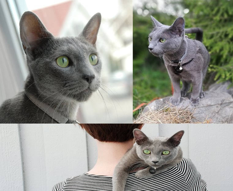 Helgrå med grønne øyne. Store ører. Ganske sky overfor fremmede mennesker. Liten katt, rundt 3 kg.