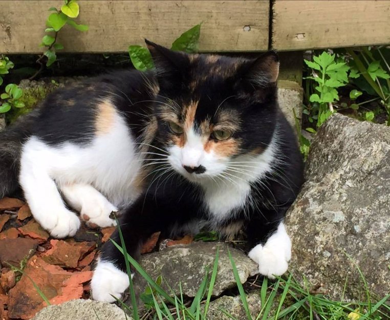 Liten og spinkel hunnkatt, ca. 10 mnd? Ganske tynn. Veldig tillitsfull og kjælen. Tricolour, svart flekk på snuten.