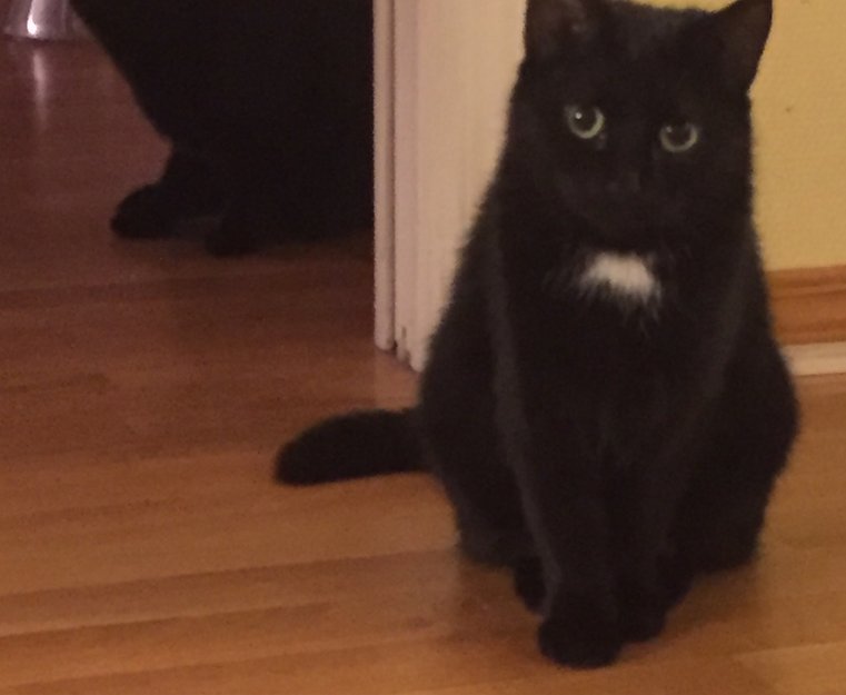 Svart hunnkatt med stor hvitt prikk på brystet. Veldig sky og lar seg ikke klappe