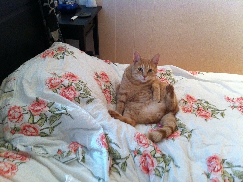 Stripene er svake,han røyter,og han er beige/brun/orange og litt hvit om snuten. Snill og godtroende.