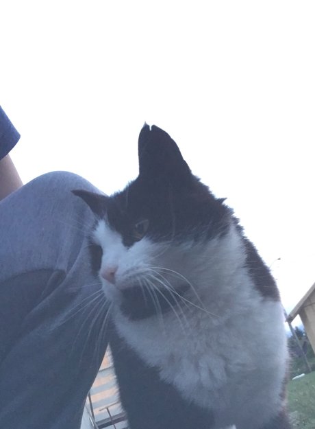 Har bodd utenfor her vi leier i lang tid, tror det er ei jente. kontaktsøkende og tynn pus. Svart og hvit.