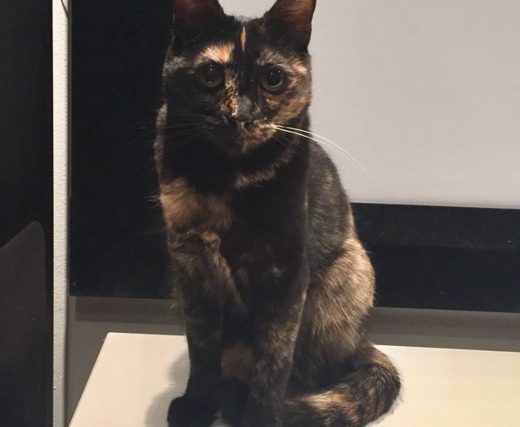 Over høyre øye er det litt lysere parti og hun har også en lys liten strek midt i pannen.