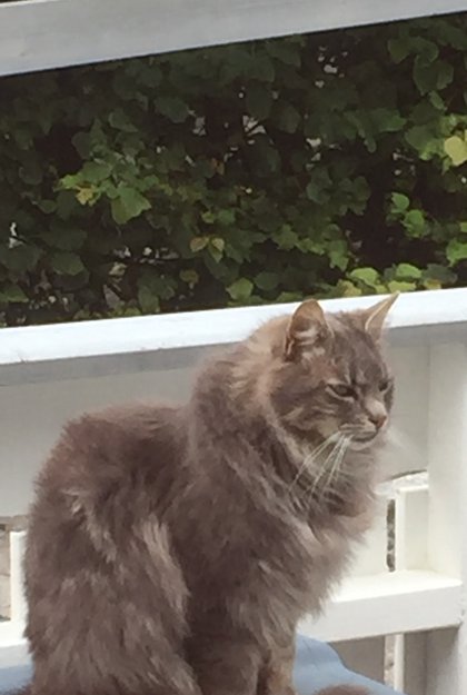 Gråbrun katt kom løpende mot oss nå vi gikk ut i ettermiddag. Veldig kosete og kontaktsøkende. Sulten, fått litt leverpostei som den slukte i seg. Har nok vært ute en stund. Nå sitter den utenfor og virker ikke som den vil gå.