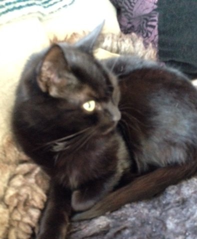 Saga er ca tre år gammel. Hun en liten pus med kort svart pels. På brystet har hun noen få hvite hårstrå.