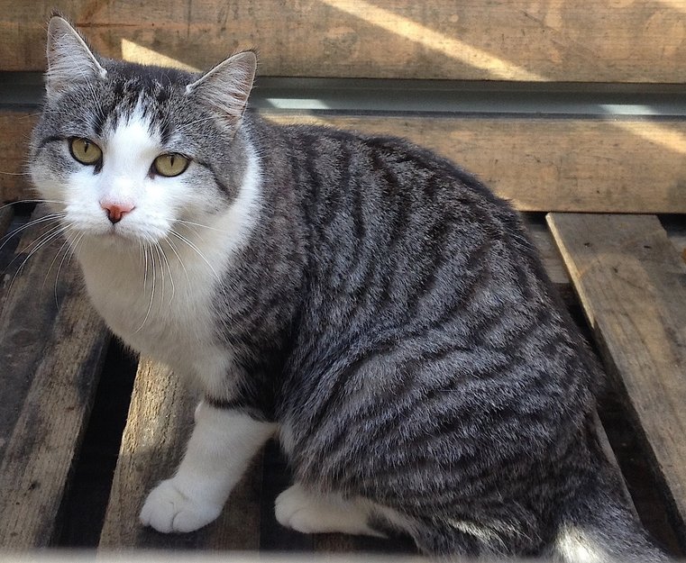 VANLIG HUSKATT. PERSONLIGHET : Vennlig, forsiktig, lav stemme. PELS: Ganske korthåret. Stripete, makrellfarget i flere grå nyanser på kropp og hale. Hvit mage, bryst og labber. Pelsen er også hvit rundt munn/ barter og nese. Hvite værhår. SPESIELLE KJENNETEGN: Rosa på nesetippen og litt svart i midten under nesetippen. Mørk kajal rundt øynene. Svart stripe fra begge de ytre øyekrokene og ut mot kinnet. På venstre fremlabb har hun en mørk stripe/ nesten som en ring øverst på den hvite labben. "Gulaktig øyenfarge."