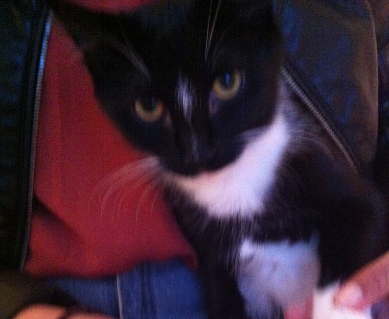 LIten og søt! Mest svart, svart ansikt og kropp, hvit på halsen/magen og labbene. Svart flekk på det hvite på et av bakbeina.