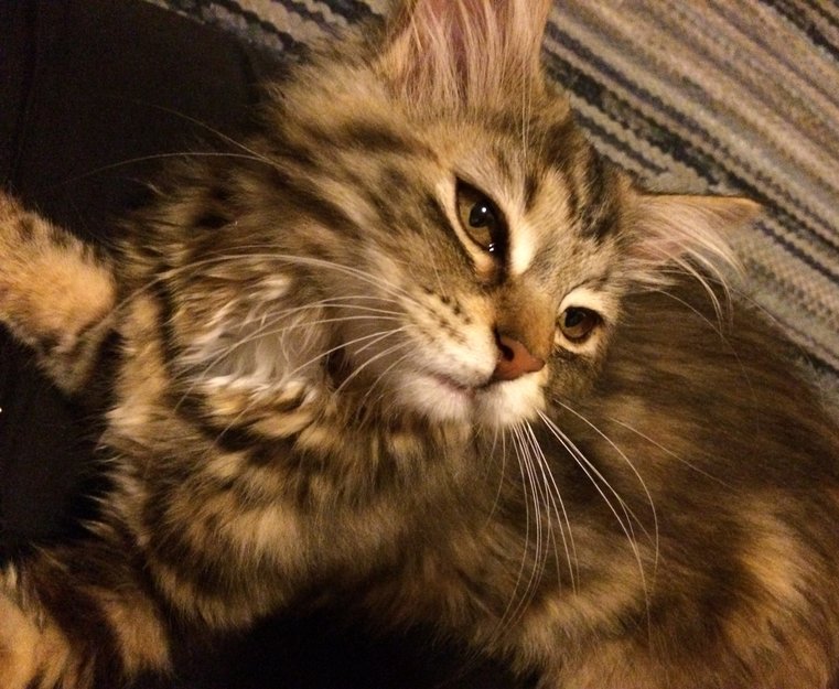 Kvit rundt munnen, kvit pels i øyrene. Mørkegrå, lysegrå og oransje elles i pelsen. Langhåra.