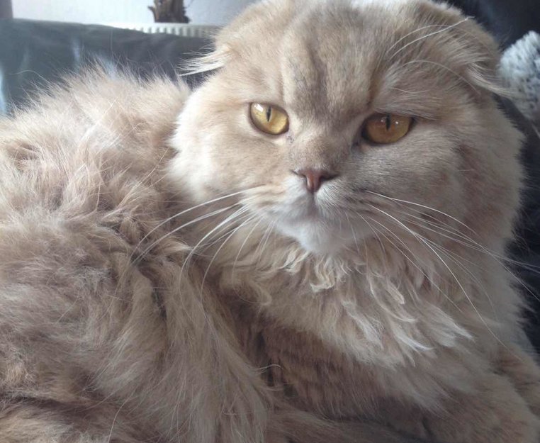 Hun er en stor og pusete katt som veier ca. 5 kg. Hun er litt redd for ukjente mennesker og andre katter. Katten er 1 år gammel. Det som man ser først og fremst er ørene hennes - de henger ned. Hun har store og kraftige labber.