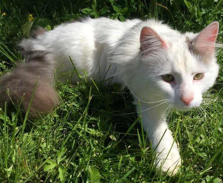 Hvit katt med grå hale og gråe avtegninger rundt øret og på ryggen.