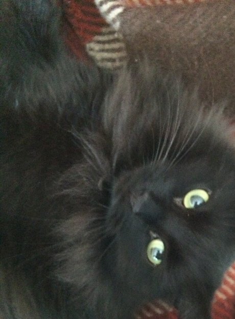 Langhåret svart katt med stor hårete hale.