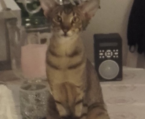 En tynn katt med tynt lite hode, mest sansynlig en kattunge. Skriker og har det ikke bra.