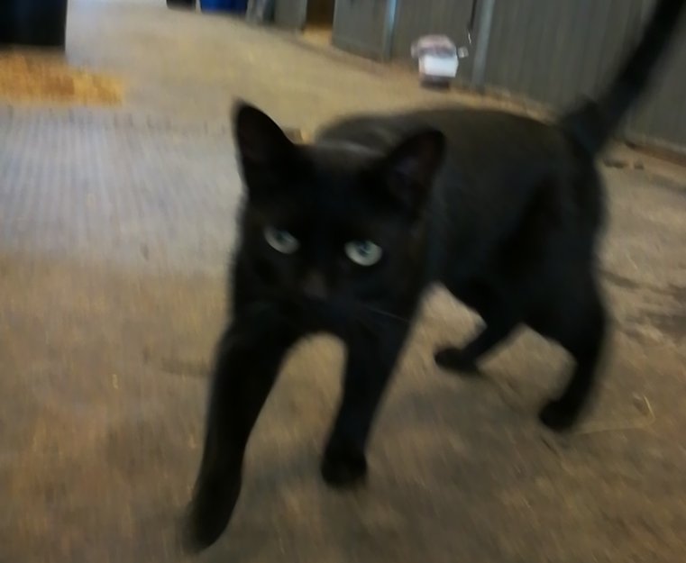 Svart tynn pus vandrer rundt alvøen ridesenter. Veldig kontantsøkende og sulten.