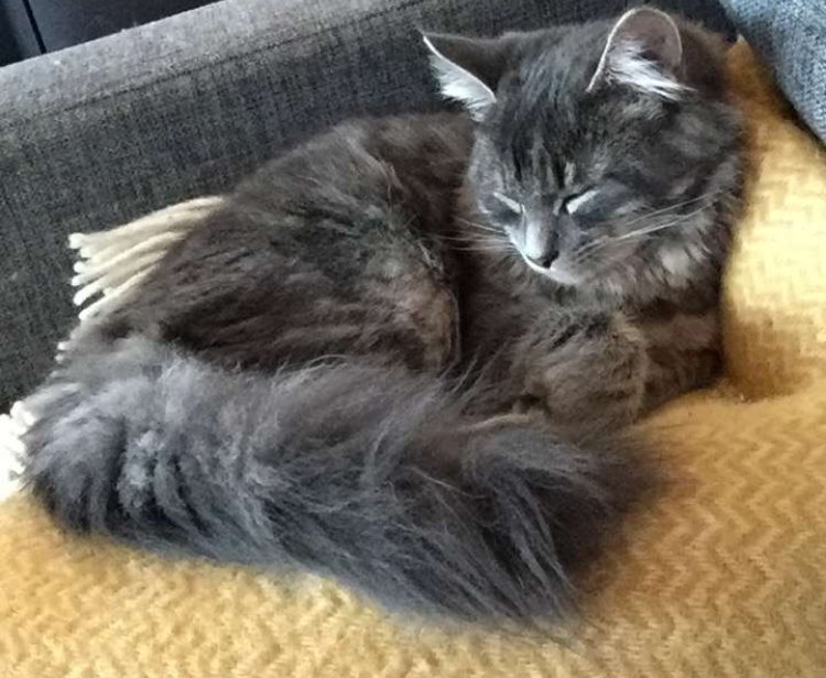 Lang lys grå pels, hun er liten, enda synlig merke/arr etter steriliseringen, mørk grå på ryggen.